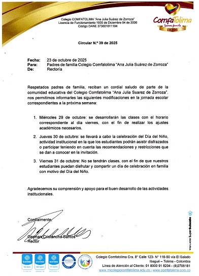 Circular No. 39 - Modificaciones en la jornada escolar de la ultima semana de Octubre